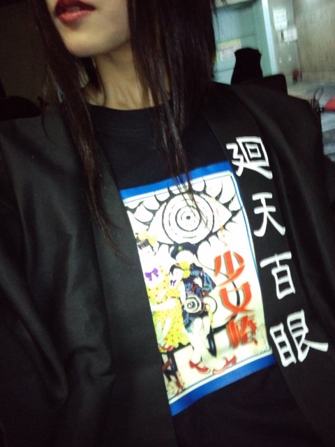百眼団員俳優陣で◎ きゃいきゃい。 そして今回! 廻天百眼十発目本公演『少女椿』に先駆けまして オリジナルTシャツの先行予約を受け付けしておりました◎ 丸尾末広先生の完全描きおろし!一番新しいみどりちゃん! 見辛いのですが、こんな感じ。 上に羽織っているのは今回から登場した、百眼関係者用法被です。 |